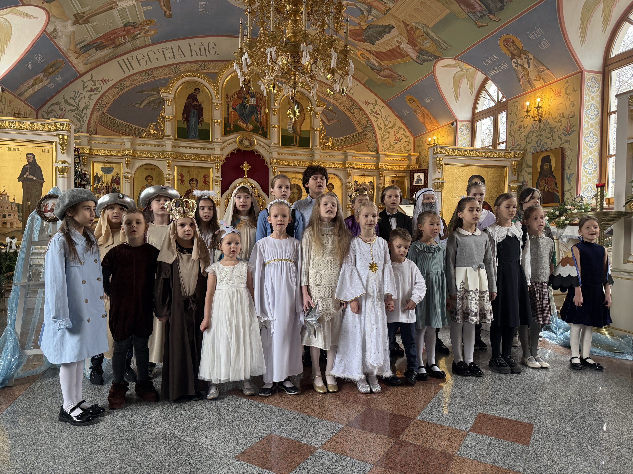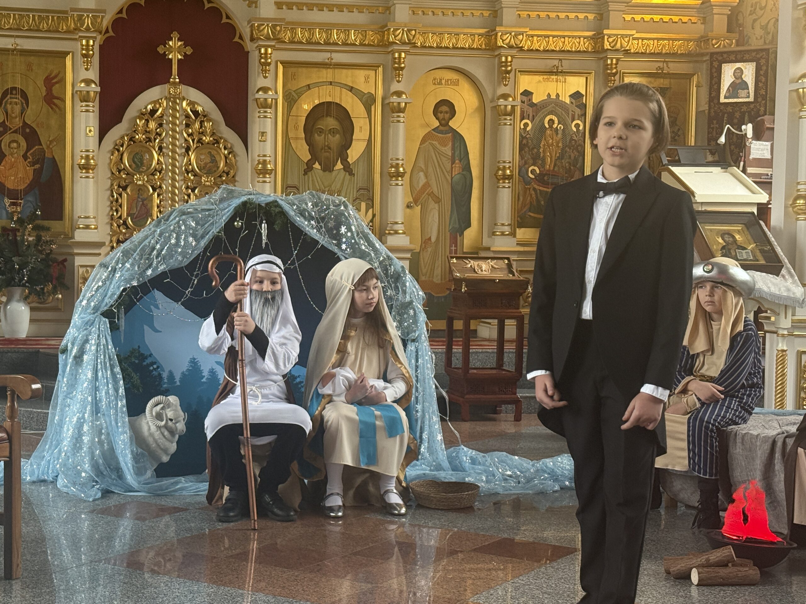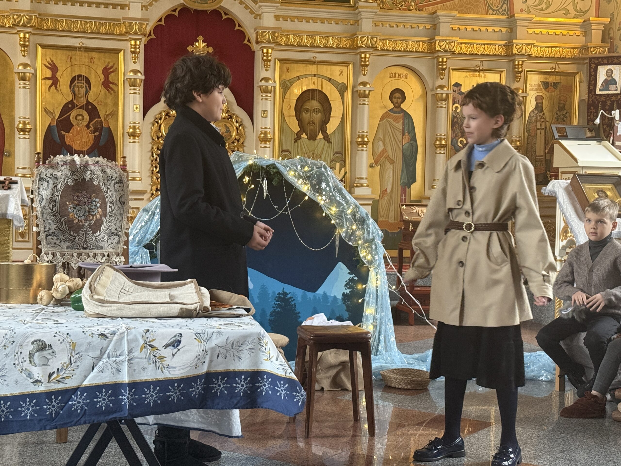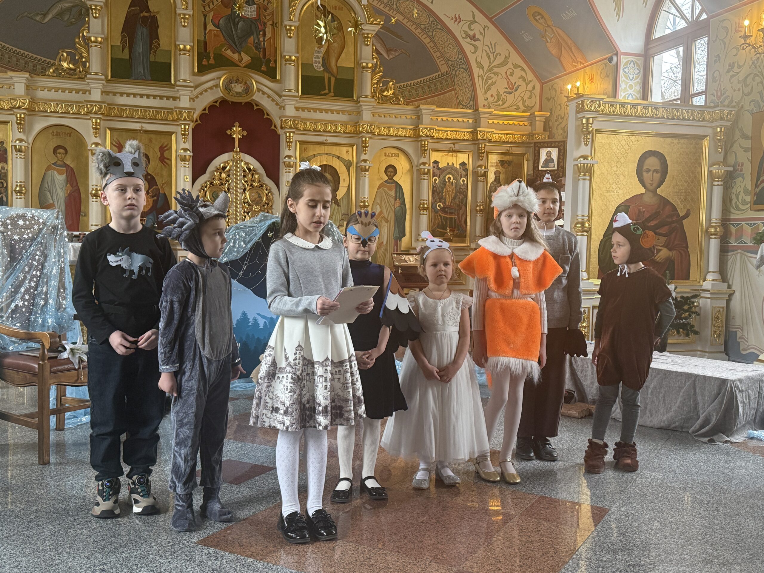 Учащиеся воскресной школы совместно с учителями подготовили небольшой концерт с Рождественскими песнопениями и стихами, а также представили вниманию зрителей три театральные миниатюры с тематикой Рождества. После концерта состоялось совместное чаепитие. Все присутствовавшие на празднике дети — как выступавшие, так и среди числа зрителей — традиционно получили сладкие подарки от настоятеля храма.